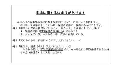 PTA保護者証を持参いただくこと、家族・親戚のみの入場になることを