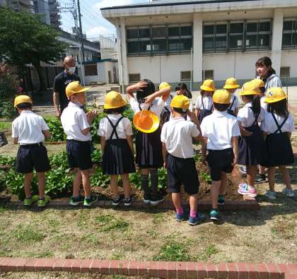 6月16日(金)、体育館前の学習園で、さつまいも畑の草抜きをしていました。とても皆が協力的で綺麗になりました。