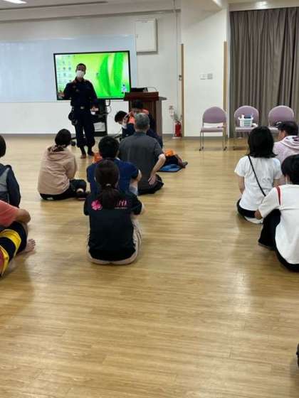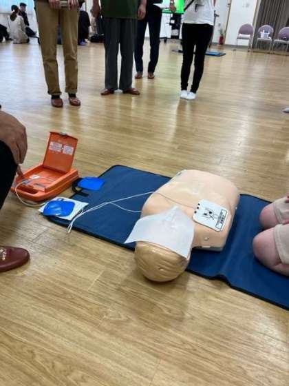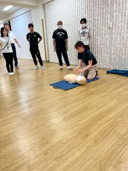 緊急時の対応に関する説明を受けたり、心肺蘇生法や人工呼吸法、AEDの使い方を学んでいます。