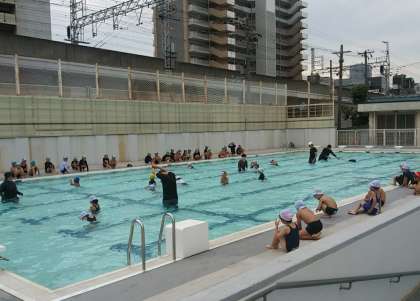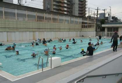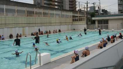 1,2年生に分かれて、一方のプールサイドから向かい側のプールサイドへと往復していました。水中歩行、水中に顔を浸けて歩行、少しだけ長い時間(5秒程)、顔を水に浸けて歩行、に取り組んでいました。最後に、水中宝探しで楽しみました。