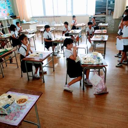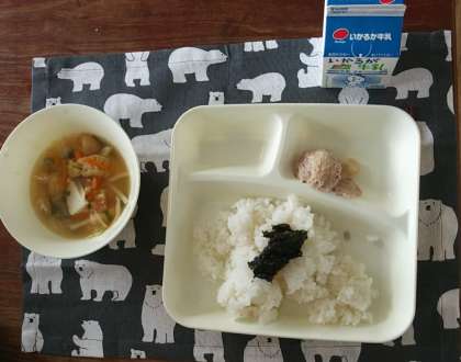 6月21日(水)、今日の献立は、ごはん、豚肉の甘辛焼き、五目汁、のりのつくだ煮、牛乳です。「つくだ煮」とは、魚介類や海藻などの食材をしょうゆや砂糖、みりんなどの調味料で煮詰めたものです。水分が少なく、防腐作用があるため、保存性が高くなります。