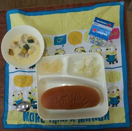 6月22日(木)、今日の献立は、黒糖パン、かぼちゃのクリームシチュー、キャベツのゆずドレッシング、和なしの缶詰、牛乳です。