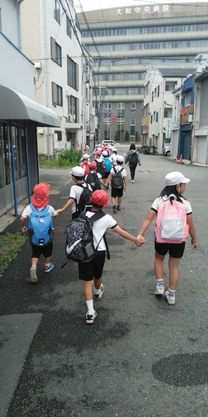 1・2年生が仲良くペアで歩いています。
