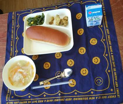 6月29日(木)、今日の献立は、黒糖パン、鶏肉のカレー風味焼き、てぼ豆のスープ、三度豆とコーンのサラダ、牛乳です。