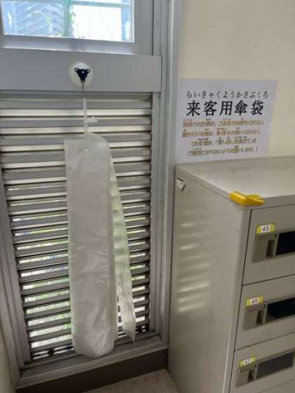 雨が降っているとき、陽射しの強いとき、学校に傘を持って来られたときのために、来客用靴箱の近くに傘袋を設置しました。