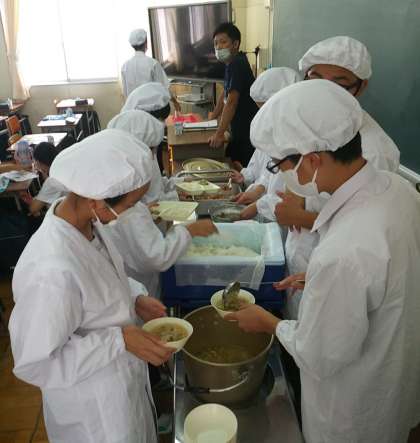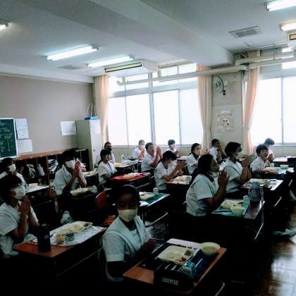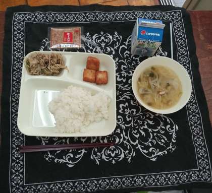7月7日(金)、今日の献立は、ごはん、ゴーヤチャンプルー、五目汁、厚揚げのしょうがじょうゆかけ、牛乳です。