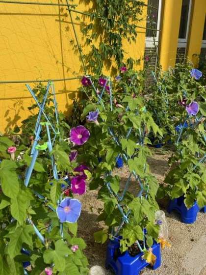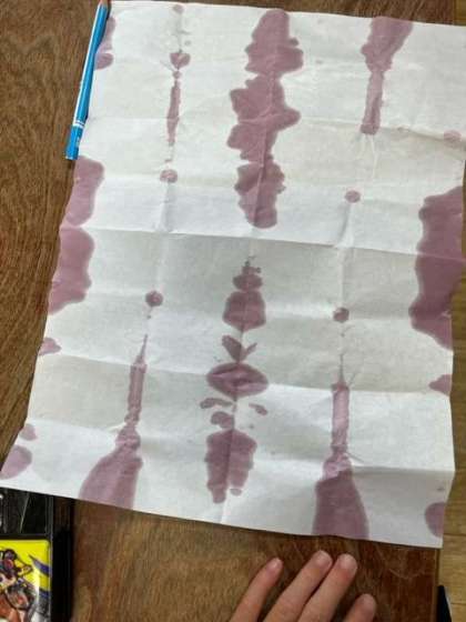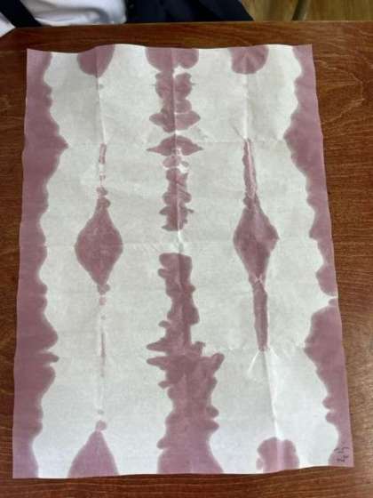 朝顔の花を絞った染液に、折った紙の端を浸し、紙を広げてみると、予想もつなかなかった模様が現れました。