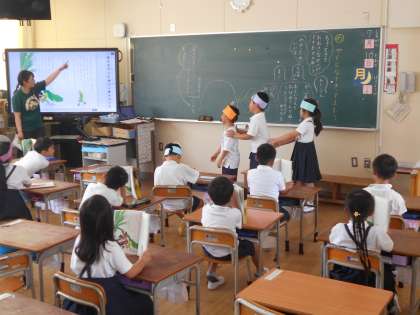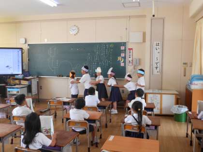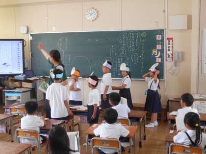 2時間目、1年生は国語科「おおきなかぶ」の学習でした。子どもたちは、登場人物になりきって、様子がわかるように大きな声で音読をしていました。また、代表児童が前に出て、大きなかぶを引っこ抜くところをみんなで声を掛け合って動作化していました。とても楽しそうに学習に取り組んでいました。