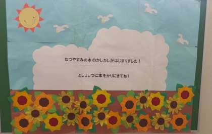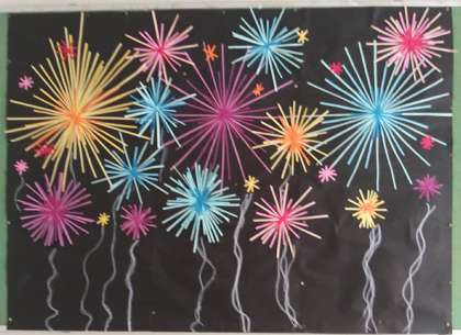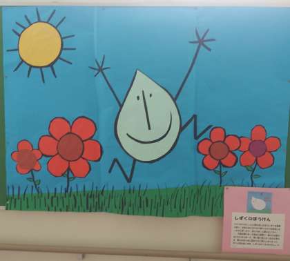 新館玄関ホールの夏の風物詩「大花火」や職員室前階段の踊り場に掲示されている作品は、ともに児童生徒たちが協力して作り上げたものです。