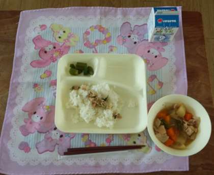 7月12日(水)、今日の献立は、ごはん、豚肉とじゃがいもの煮物、オクラの梅風味、ツナっ葉いため、牛乳です。