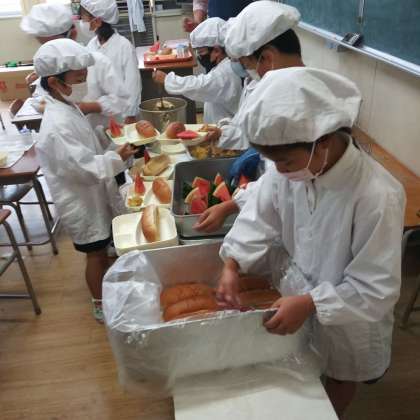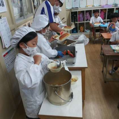 7月13日(木)、今日の献立は、黒糖パン、パエリア、ウインナーとキャベツのスープ、スイカ、牛乳です。