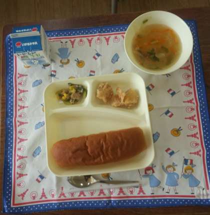 7月18日(火)、今日の献立は、黒糖パン、鶏肉の唐揚げ、とうがんの中華スープ、ツナとチンゲンサイの炒めもの、牛乳です。