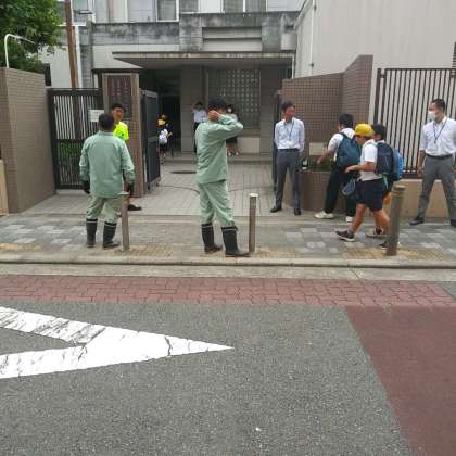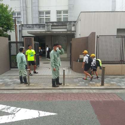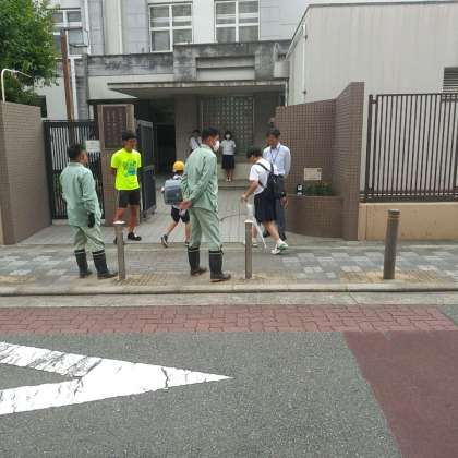 7月19日(水)、今朝の通用門の様子です。朝から気温も上昇していますが、元気に登校しています。