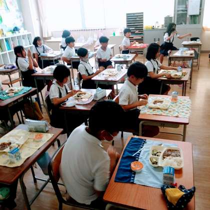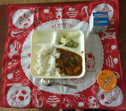 7月19日(水)、今日の献立は、夏野菜カレーライス、キャベツときゅうりのサラダ、みかんゼリー、牛乳です。