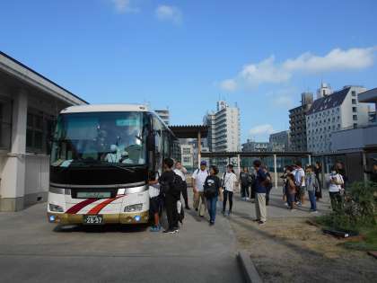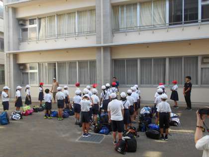 5年生は今日から2泊3日の行程でハチ北高原での林間学習に出発しました。校長先生のお話を聞いて、みんなで林間学習のめあてを確認しました。子どもたちは元気に出発しました。