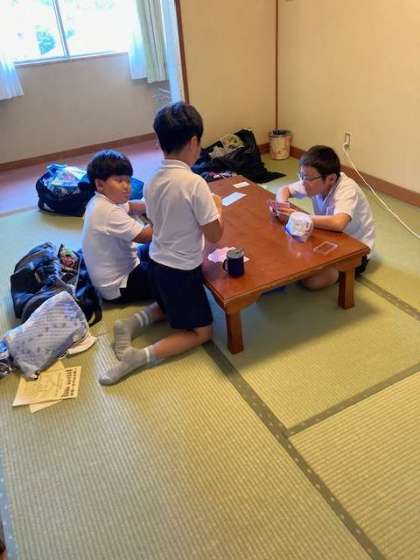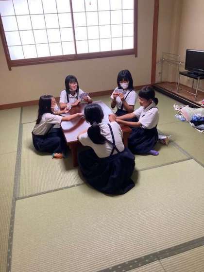 入浴までの空き時間、部屋でトランプをしてくつろいでいます。こんなゆったりした時間もいいですね。