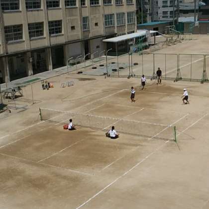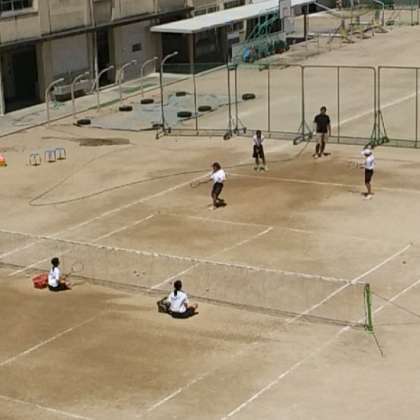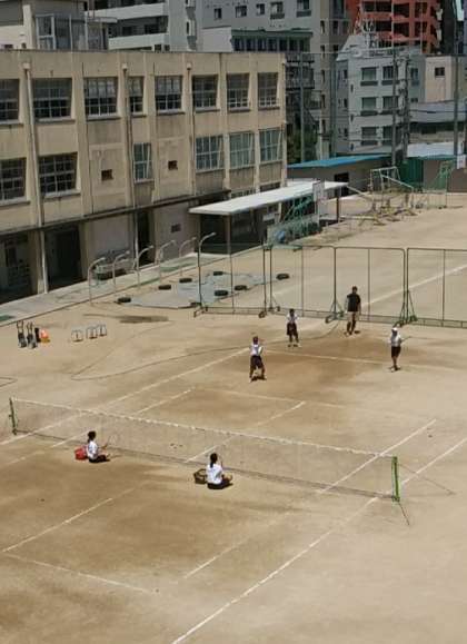 ソフトテニス部員たちは、熱くなっているコートに水を撒いてもらいながら、部活動に励んでいました。
