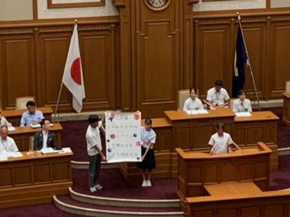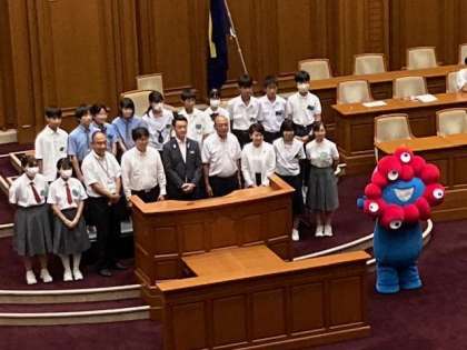 令和5年度おおさか子ども市会が午後、市会本会議場で、市内81名の中学生が集まって開催されました。「万博開催都市の中学生として、大阪市に望むこと・自分たちにできること」をテーマに中学生の質問に市長が応えるかたちで進められました。本校から参加した2名の8年生もそれぞれの役割をしっかり果たしてくれました。