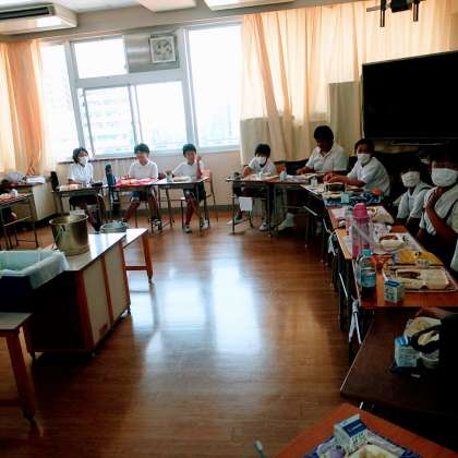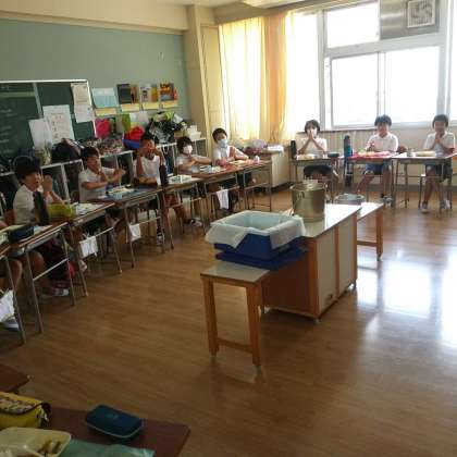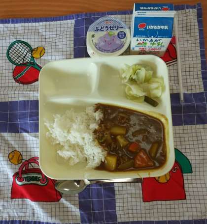 8月28日(月)、今日の献立は、ビーフカレーライス[米粉]、野菜のピクルス、ぶどうゼリー、牛乳です。今日のビーフカレーライスは、小麦粉の代わりに国産の米から作られた米粉のカレールウの素を使っています。(小麦アレルギーの人も食べることができます。)