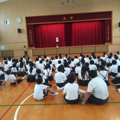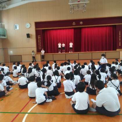 2学期最初の児童集会が体育館では、舞台上のカーテンの隙間を通過する物体は「何でしょうか?」というクイズ大会が行われていました。内容は、「エプロンセット」「上靴」「筆箱」「○○先生」でした。皆で楽しんでいる様子がみられました。