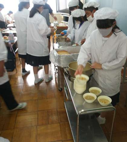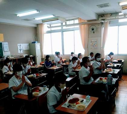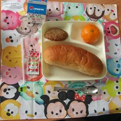 8月31日(木)、今日の献立は、黒糖パン、焼きハンバーグ、豆乳スープ、冷凍みかん、牛乳です。