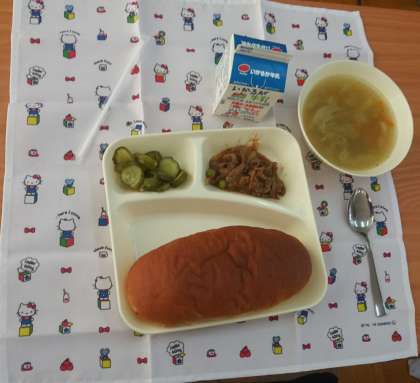 9月5日(火)、今日の献立は、コッペパン、いちごジャム、牛肉のデミグラスソース煮、スープ、きゅうりのピクルス、牛乳です。