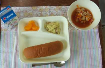 9月7日(木)、今日の献立は、黒糖パン、豆乳マカロニグラタン[米粉]、トマトスープ、みかんの缶詰、牛乳です。