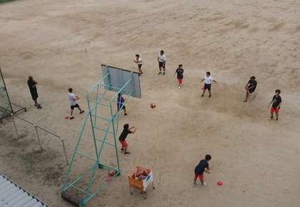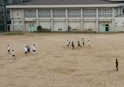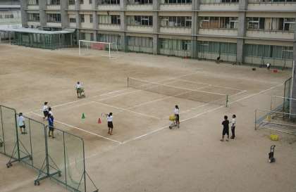 放課後の部活動で、運動場ではソフトテニス部とサッカー部が躍動し、砂場前辺りではバスケットボール部の児童たちが活動をしていました。