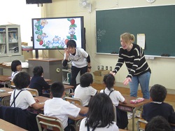 本校では毎週火・水・金の朝の15分を使って、1〜6年生が英語活動に取り組んでいます。写真は2年生のようすです。映像に合わせて歌を歌ったり、リズムに合わせて単語を正しく発声したりするなどしています。