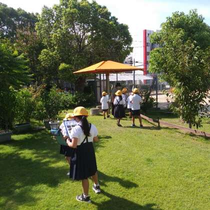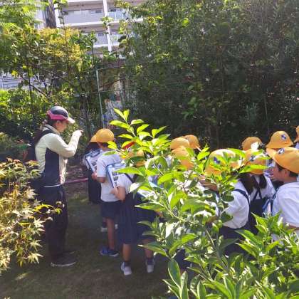 9月19日(火)昼食後、花園公園にて草木の学習会をしました。児童たちは、ふかふかの芝生の上を通り、手持ちの画板に挟んだ写真を見ながらたくさんの草花や果実を探していました。