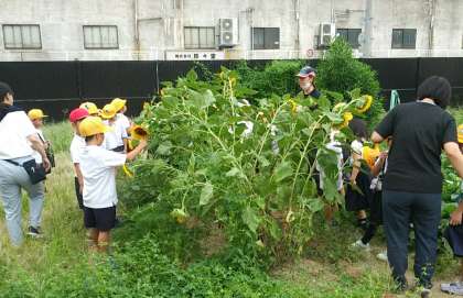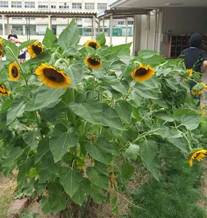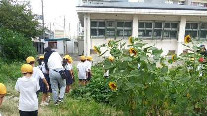 9月21日(木)、体育館前の学習園で1年生がヒマワリの観察をしていました。