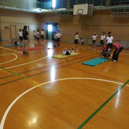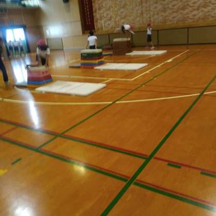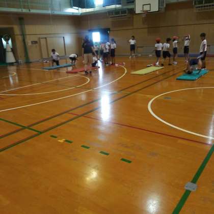 9月21日(木)、体育館にて、4年生児童たちが、マットで、前転、後転、開脚前転、開脚後転と跳び箱を跳んでいました。