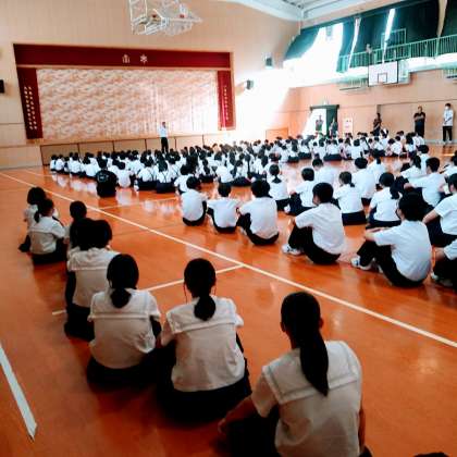 9月25日(月)、体育館にて、小中合同朝会・集会が行われました。