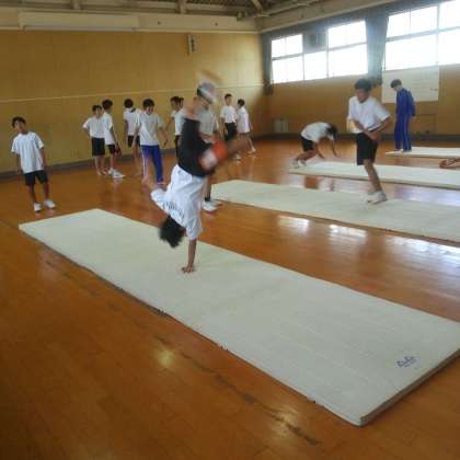 9月26日(火)、格技室で、倒立前転や側転のマット運動をしていました。