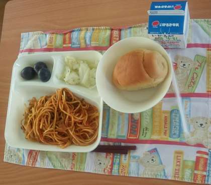 9月27日(水)、今日の献立は、小黒糖パン、イタリアンスパゲッティ、キャベツのバジル風味サラダ、ブドウ(巨峰)、牛乳です。