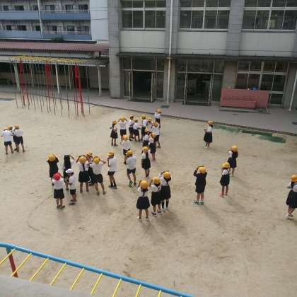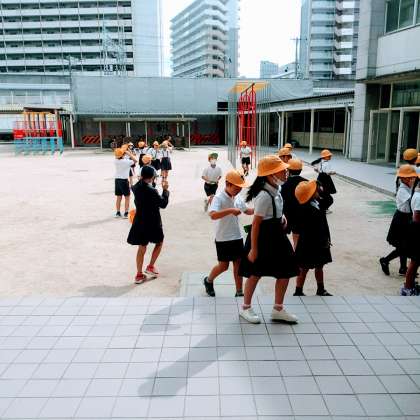10月3日(火)、中庭にて、児童たちは、しゃ光カバーを通して、太陽の形を観察していました。その後、鏡を使って、太陽光を壁に反射する様子を観察していました。