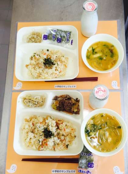 加薬ご飯は炊き立てのご飯に出来立ての具を混ぜて仕上げています。具がたっぷりの加薬ご飯に旬のかぼちゃやしめじの味噌汁を組み合わせて秋を感じる献立になっています。