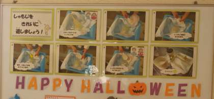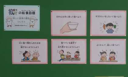 新館1階の玄関ホールと給食配膳室前の壁に10月の給食目標等が掲示されています。