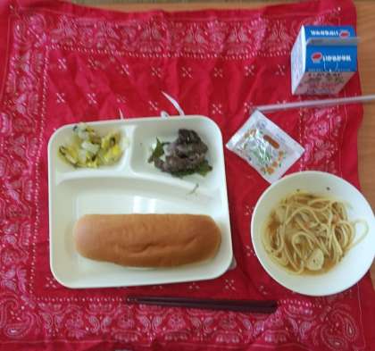 10月16日(月)、今日の献立は、コッペパン、アプリコットジャム、牛肉の香味焼き、ホタテ貝とトマトのスープスパゲッティ、白菜のピクルス、牛乳です。
