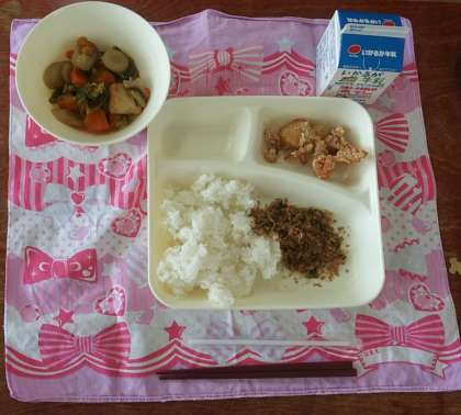 10月17日(火)、今日の献立は、ごはん、鶏肉の竜田揚げ、厚揚げと野菜の煮物、おかかなっ葉、牛乳です。