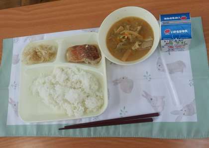 10月20日(金)、今日の献立は、ごはん、赤魚の醤油だれかけ、豚汁、もやしのゆずの香あえ、牛乳です。「食後の過ごし方」食後、胃では食べ物と消化液を混ぜる消化運動が始まります。消化酵素の働きによって栄養分を分解し、体内に取り入れやすくしています。この時に激しい運動を行うと胃腸の働きが鈍くなり、食べ物を十分に消化できなくなります。