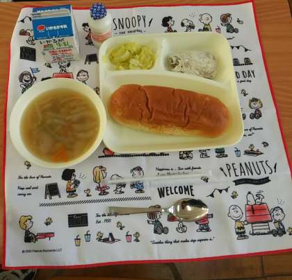 10月23日(月)、今日の献立は、おさつパン、かつおのガーリックマリネ焼き[ノンエッグドレッシング]、ウインナーとじゃがいものスープ、キャベツのサラダ、発酵乳(中学生のみ)牛乳です。