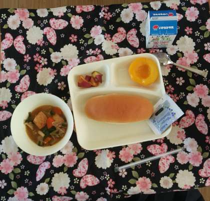 10月30日(月)、今日の献立は、コッペパン、ブルーベリージャム、豚肉といかの中華煮、大学いも、黄桃の缶詰、牛乳です。
