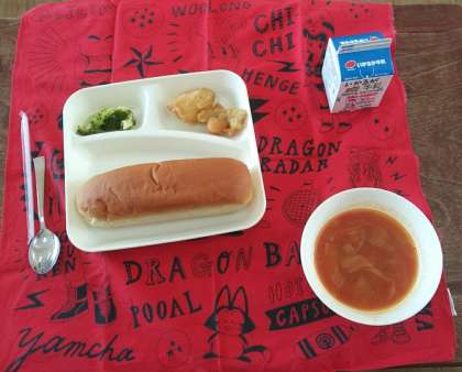 11月2日(木)、今日の献立は、黒糖パン、白身魚フリッター、ミネストローネ、ブロッコリーのサラダ、牛乳です。