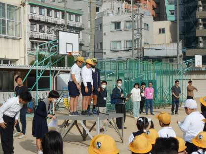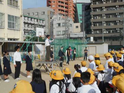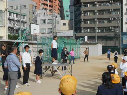 11月6日(月)、運動場で小中合同朝会・集会が行われました。