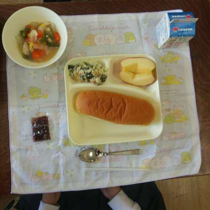 11月7日(火)、今日の献立は、コッペパン、いちごジャム、ほうれん草のグラタン、スープ煮、りんご、牛乳です。
