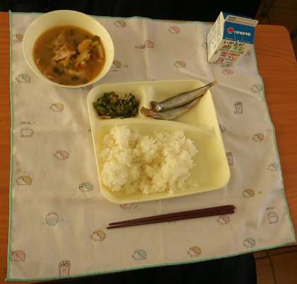 11月9日(木)、今日の献立は、ごはん、焼きししゃも、味噌汁、こまつなの炒めもの、牛乳です。