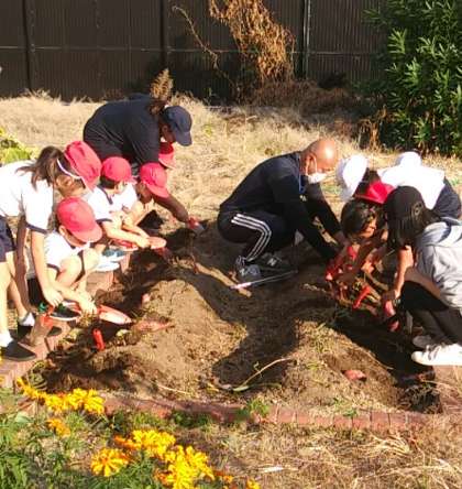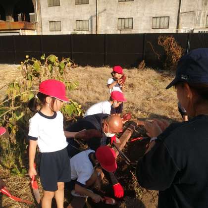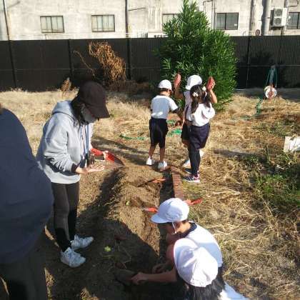 11月9日(木)、2年生たちが、体育館前学習園にて、5月頃に苗を植えて育ててきたさつまいもを収穫しました。昨年度に比べると1カ月遅れの収穫となりましたが、大きく育っていました。このさつまいもは、教室前で3週間程日影で干します。