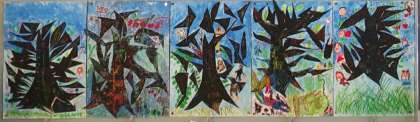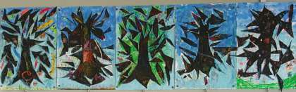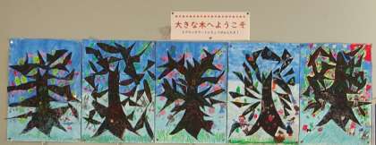 「大きな木へようこそ」というスクラッチアートが教室や階段の踊り場に掲示されています。