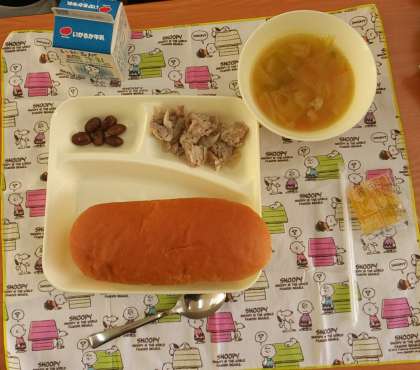 11月14日(火)、今日の献立は、コッペパン、マーマレード、豚肉のバジル焼き、スープ、うずら豆のグラッセ、牛乳です。